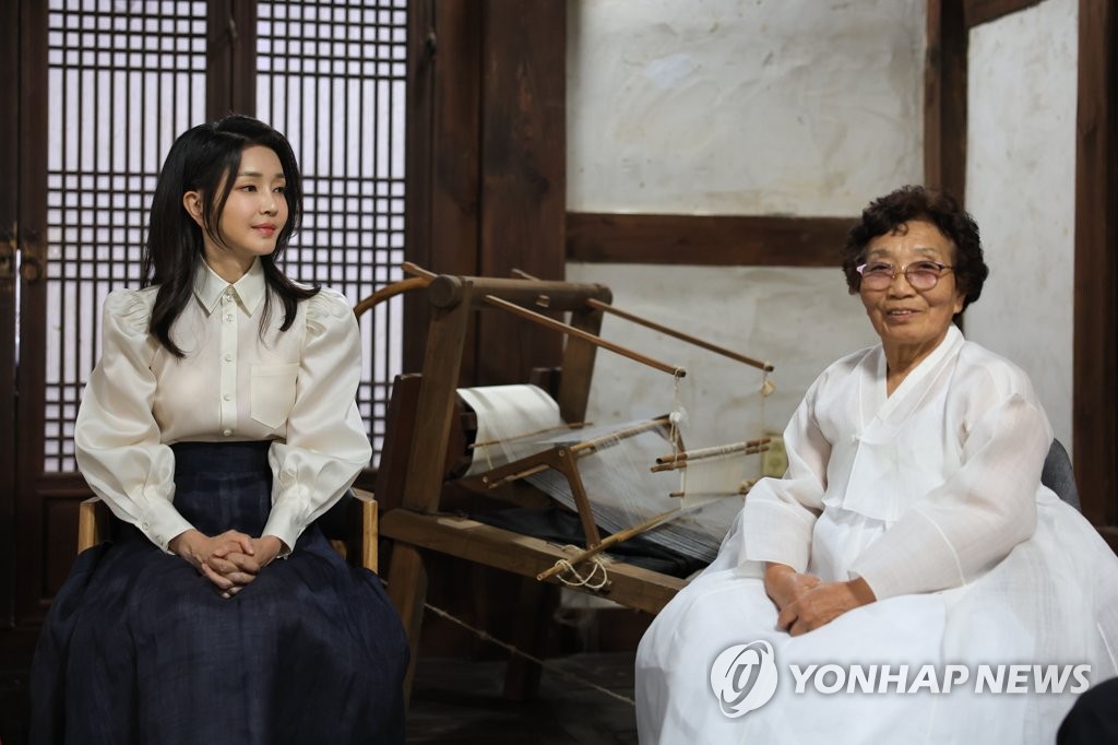 김 여사는 이날 한산모시짜기 국가무형문화재 기능보유자인 방연옥 장인 안내로 한산모시관 공방에서 무형문화재 전승 교육사, 이수자 등 관계자들과 간담회를 했다.