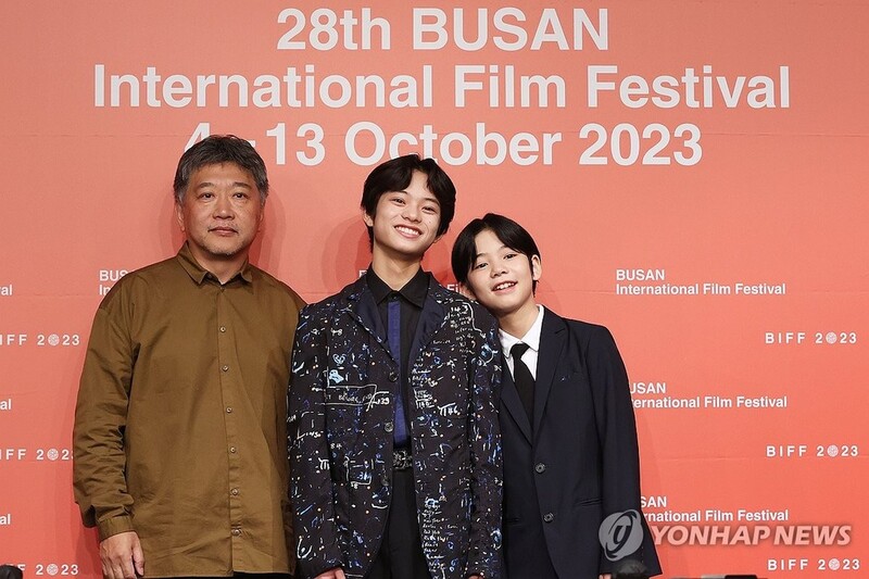| ▲ 영화 '괴물' 감독과 배우 (부산=연합뉴스) 강민지 기자 = 7일 오후 부산 해운대구 KNN시어터에서 열린 '제28회 부산국제영화제' 갈라 프레젠테이션 '괴물' 기자회견에서 참석자들이 기념촬영하고 있다. 왼쪽부터 고레에다 히로카즈 감독, 구로카와 소야, 히이라기 히나타. 2023.10.7 mjkang@yna.co.kr |