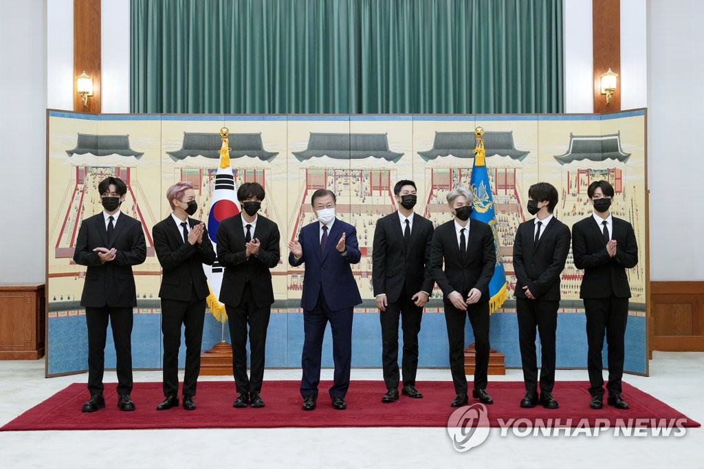 ▲ BTS와 기념사진 촬영하는 문 대통령 (서울=연합뉴스) 최재구 기자 = 문재인 대통령이 14일 청와대에서 열린 미래세대와 문화를 위한 대통령 특별사절 임명장 수여식에서 그룹 BTS에게 임명장을 수여하고 기념사진을 촬영하고 있다. 왼쪽부터 뷔, 제이홉, 진, 문 대통령, RM, 슈가, 지민, 정국. 2021.9.14 jjaeck9@yna.co.kr