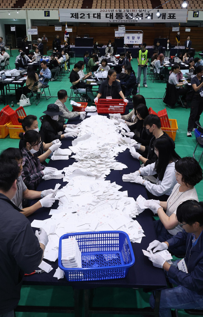 Election administration officials sort ballots at a ballot counting station in Seoul's Gwanak Ward on June 3, 2025, after voting ended in the presidential election. (Yonhap)