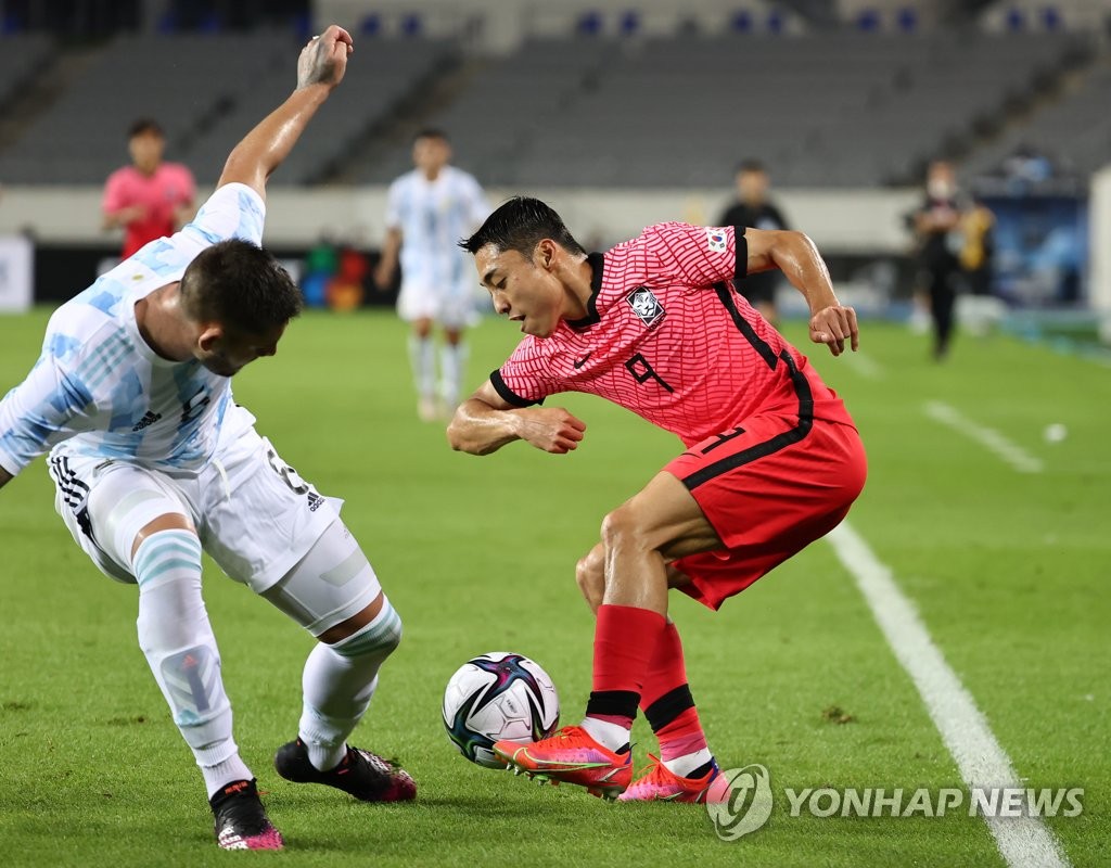 | ▲ Hwang Ui-jo of South Korea (R) tries to control the ball against Leonel Mosevich of Argentina in the teams' Olympic men's football tuneup match at Yongin Mireu Stadium in Yongin, 50 kilometers south of Seoul, on July 13, 2021. (Yonhap) |