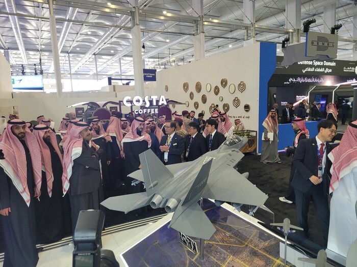 This photo, provided by the state-run Korea Aerospace Industries Ltd. (KAI), shows a KAI official explaining the South Korean-made KF-21 fighter to Saudi Defense Minister Khalid bin Salman Al Saud (5th from L, front row) at the KAI booth during the World Defense Show in Riyadh, Saudi Arabia, on Feb. 4, 2024. (PHOTO NOT FOR SALE) (Yonhap)