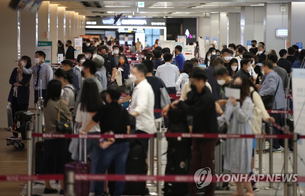| ▲ This photo taken on Oct. 8, 2021, shows people waiting at ticketing counters at Gimpo International Airport in western Seoul ahead of an extended weekend that includes Hangeul day. (Yonhap) |