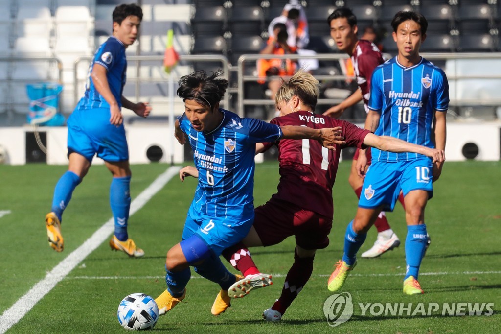 | ▲ In this AFP photo, Sin Jin-ho of Ulsan Hyundai FC (R) dribbles past Takuya Yasui of Vissel Kobe during the teams' semifinals match at the Asian Football Confederation (AFC) Champions League at Jassim bin Hamad Stadium in Doha on Dec. 13, 2020. (Yonhap) |