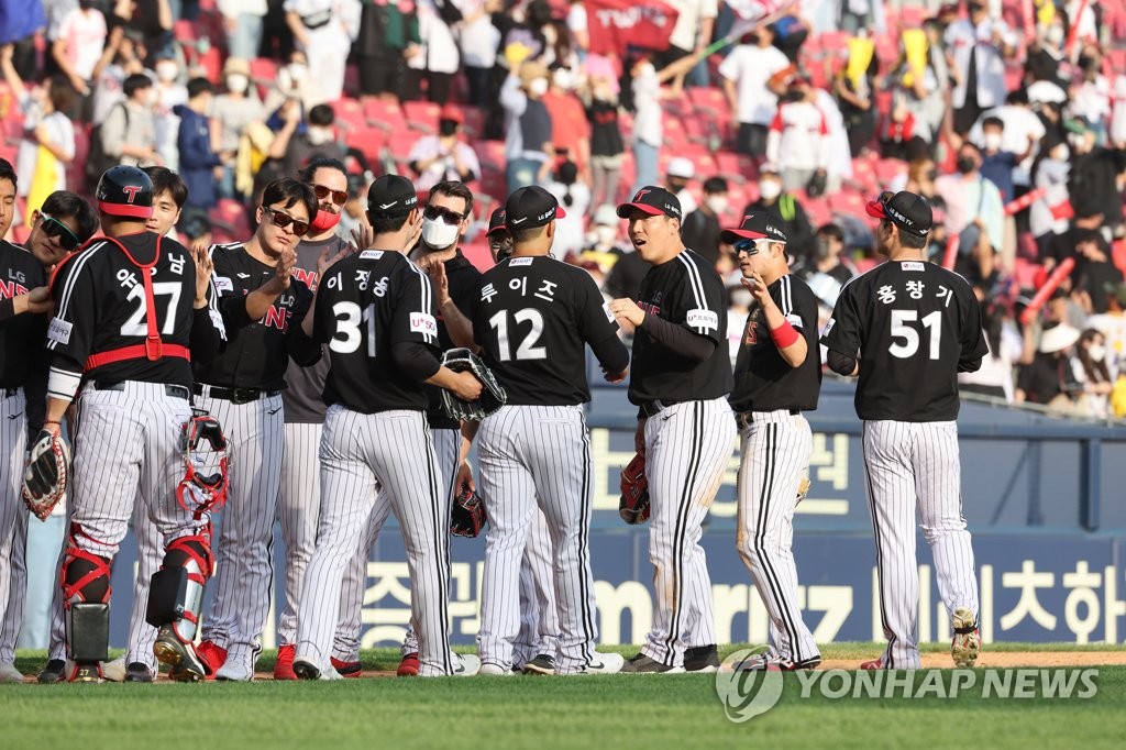 | ▲ This file photo from April 24, 2022, shows LG Twins players celebrating their 5-0 victory over the Doosan Bears in a Korea Baseball Organization regular sesaon game at Jamsil Baseball Stadium in Seoul. (Yonhap) |