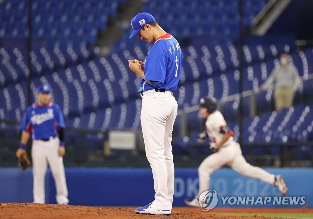 | ▲ South Korean pitcher Ko Young-pyo reacts to a solo home run hit by Nick Allen of the United States in the bottom of the fifth inning of the teams' Group B game in the Tokyo Olympic baseball tournament at Yokohama Stadium in Yokohama, Japan, on July 31, 2021. (Yonhap) |