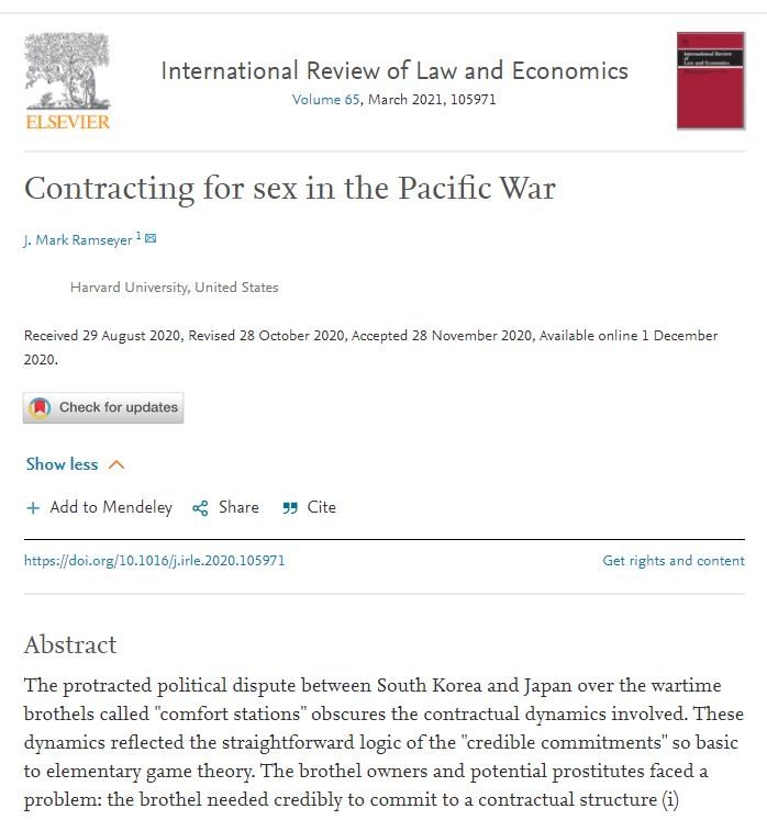 산케이신문은 램지어 교수의 양해를 얻어 논문 요지를 인터넷판에 공개했으며 논문정보 사이트 '사이언스 다이렉트'에서 논문 초록의 열람도 가능한 상태다.