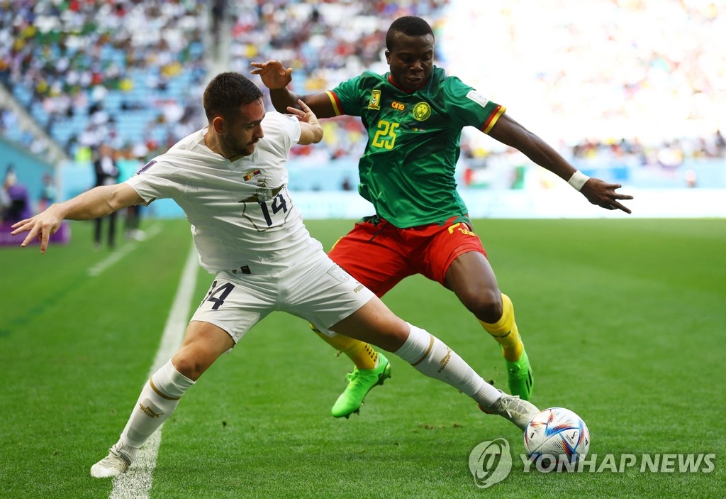 | ▲ 볼 다투는 안드리야 지브코비치와 누후 톨로 (알 와크라 로이터=연합뉴스) 28일(현지시간) 카타르 도하 알 와크라 알 자눕 경기장에서 열린 2022 국제축구연맹(FIFA) 카타르 월드컵 조별리그 G조 2차전 카메룬 대 세르비아 경기에서 안드리야 지브코비치(왼쪽·세르비아)와 누후 톨로(카메룬)가 볼을 다투고 있다. 2022.11.28 clynnkim@yna.co.kr |