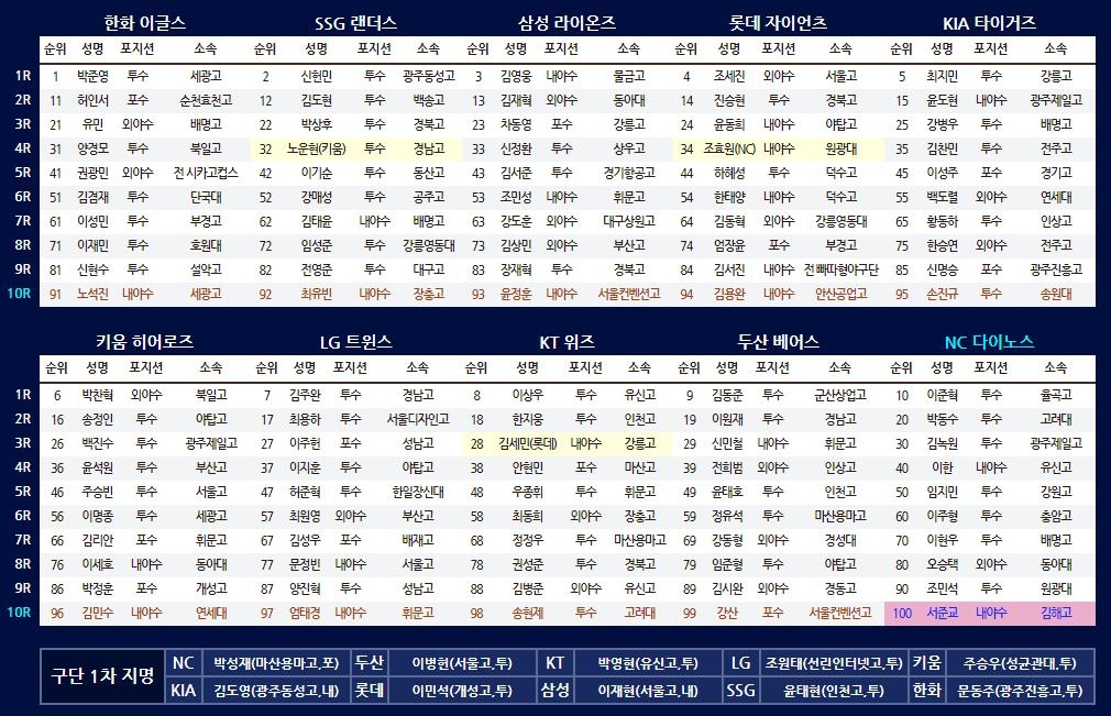 10개 구단은 1라운드부터 10라운드까지 총 100명의 선수를 뽑는다.