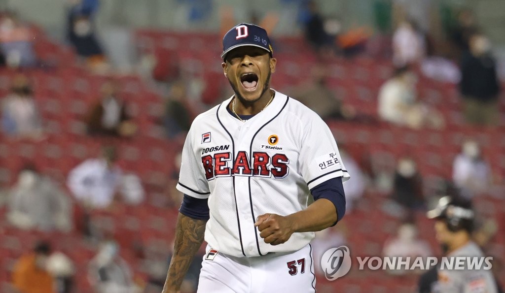 | ▲ 위기 넘기고 환호하는 두산 미란다 [연합뉴스 자료사진] |