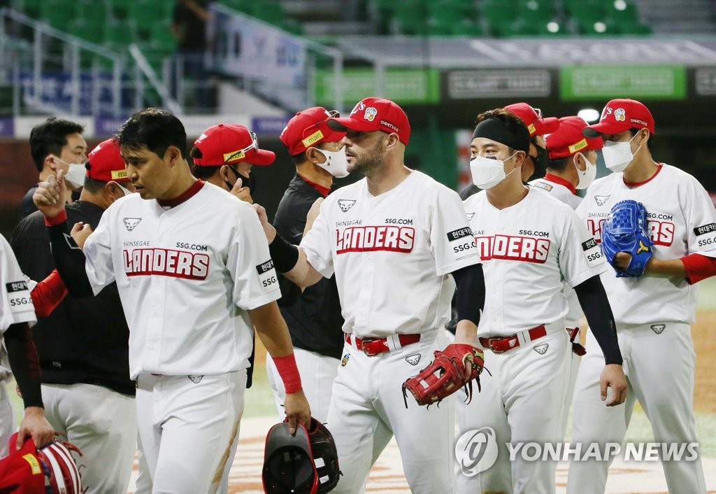 | ▲ '우리가 이겼다' (인천=연합뉴스) 김상연 기자 = 8일 인천 SSG 랜더스필드에서 열린 프로야구 SSG 랜더스와 LG 트윈스의 경기. 5-3으로 승리한 SSG 선수들이 서로 격려하며 기뻐하고 있다. 2021.9.8 goodluck@yna.co.kr |