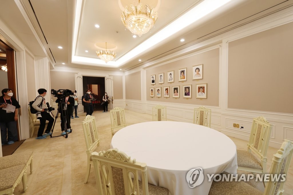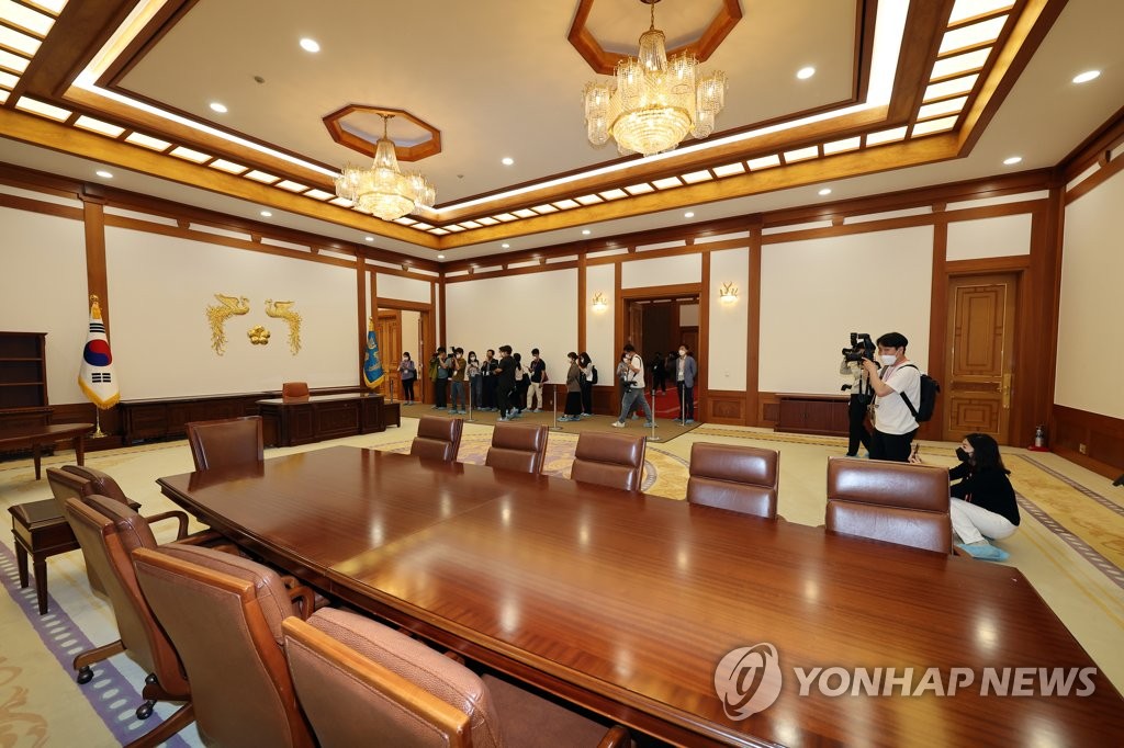 | ▲ 이곳은 청와대 무궁화실 (서울=연합뉴스) 박동주 기자 = 25일 오후 청와대 무궁화실에서 취재진이 내부를 둘러보고 있다. 대통령실은 26일부터 청와대 본관 내부를 개방하고, 관저 건물 내부도 공개하겠다고 밝혔다. 2022.5.25 pdj6635@yna.co.kr |
