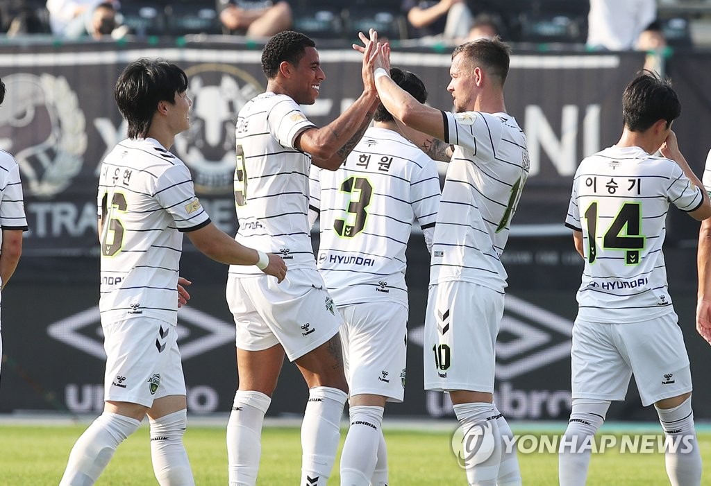 | ▲ 득점 세리머니를 펼치는 포항 스틸러스 선수들 [한국프로축구연맹 제공. 재판매 및 DB 금지] |