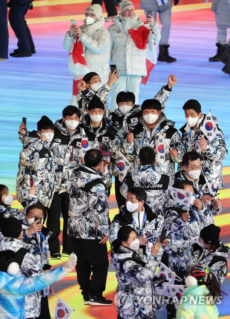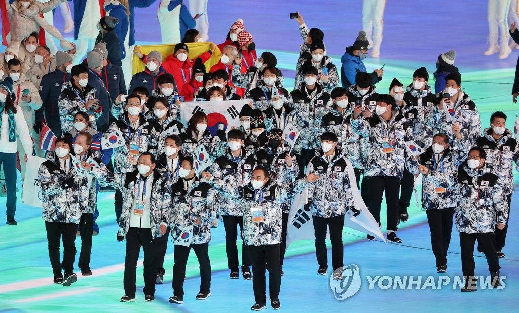 | ▲  South Korean athletes and officials enter the National Stadium in Beijing for the closing ceremony of the 2022 Beijing Winter Olympics on Feb. 20, 2022. (Yonhap) |