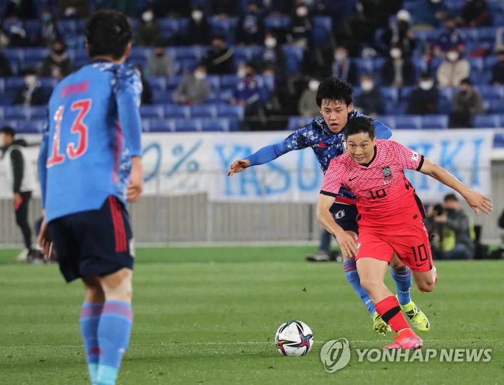 | ▲ 남태희, '다 비켜' (도쿄=연합뉴스) 이세원 특파원 = 25일 일본 가나가와현 요코하마시 닛산스타디움에서 열린 80번째 한일전에서 한국 남태희가 드리블 돌파를 시도하고 있다. 2021.3.25 sewonlee@yna.co.kr |