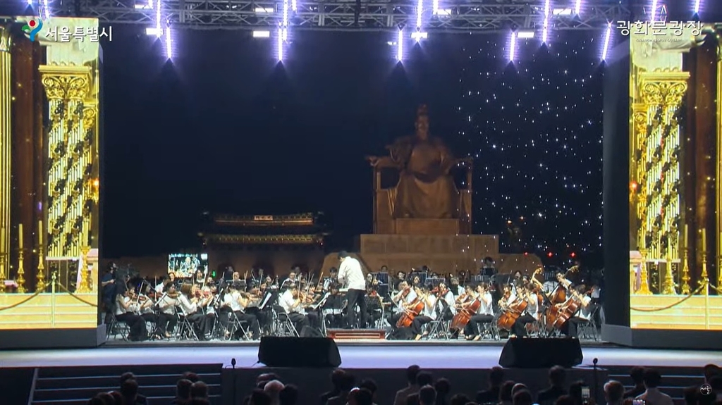 (서울=연합뉴스) 김준태 기자 = 6일 시민의 품으로 다시 돌아온 광화문광장에서 '빛과 화합'을 주제로 기념행사가 열렸다. 화려한 조명과 아름다운 오케스트라 선율이 도심의 여름밤을 물들였다.
