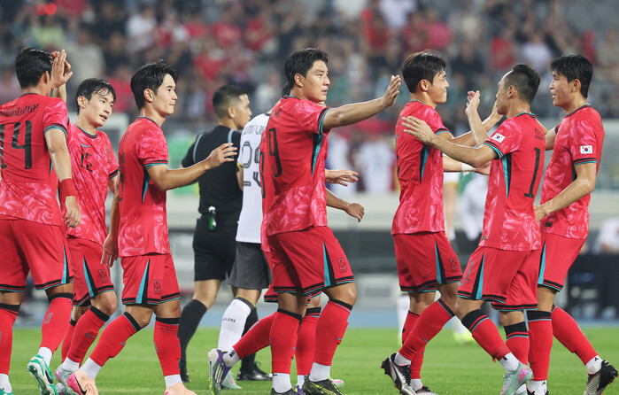 South Korea's Joo Min-kyu (C) celebrates with his teammates after scoring the team's second goal with a header against China during the first half of an East Asian Football Federation E-1 Men's Football Championship match at Yongin Mireu Stadium in Yongin, south of Seoul, on July 7, 2025. (Yonhap)
