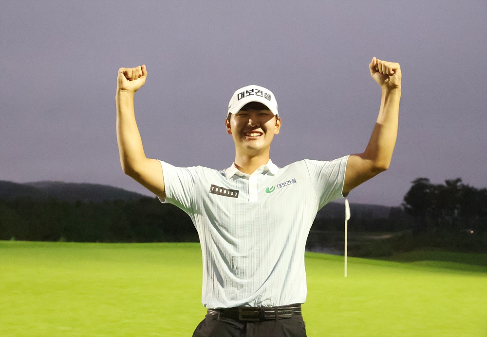 | ▲ 라이트를 켠 채 열린 연장전에서 승리하고 두 팔을 치켜든 고군택. [KPGA 제공. 재판매 및 DB 금지] |