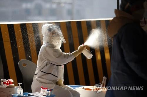 | ▲ A health worker sprays disinfectant at a makeshift testing station in the southwestern city of Gwangju on Jan. 7, 2022, in this photo provided by a local government. (PHOTO NOT FOR SALE) (Yonhap) |
