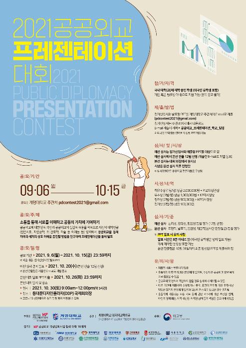 (서울=연합뉴스) 강성철 기자 = 한국국제교류재단(KF)과 계명대는 '2021 공공외교 프레젠테이션 대회'를 개최한다고 9일 밝혔다.