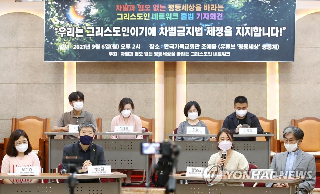 (서울=연합뉴스) 양정우 기자 = 한국기독교교회협의회(NCCK) 인권센터와 감리교퀴어함께, 천주교인권위원회 등 국내 기독교 단체 20여 곳은 6일 '차별과 혐오없는 평등세상을 바라는 그리스도인 네트워크'를 출범하고, 국회에 계류 중인 포괄적 차별금지법의 조속한 입법을 촉구했다.