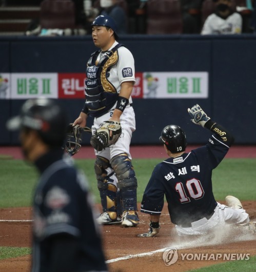 | ▲ 득점 올리는 박세혁 (서울=연합뉴스) 박동주 기자 = 17일 오후 서울 구로구 고척스카이돔에서 열린 2020 프로야구 포스트시즌 한국시리즈 1차전 두산 베어스와 NC 다이노스의 경기. 5회초 1사 2, 3루 두산 박건우의 적시타 때 박세혁이 홈인하고 있다. 2020.11.17 pdj6635@yna.co.kr |