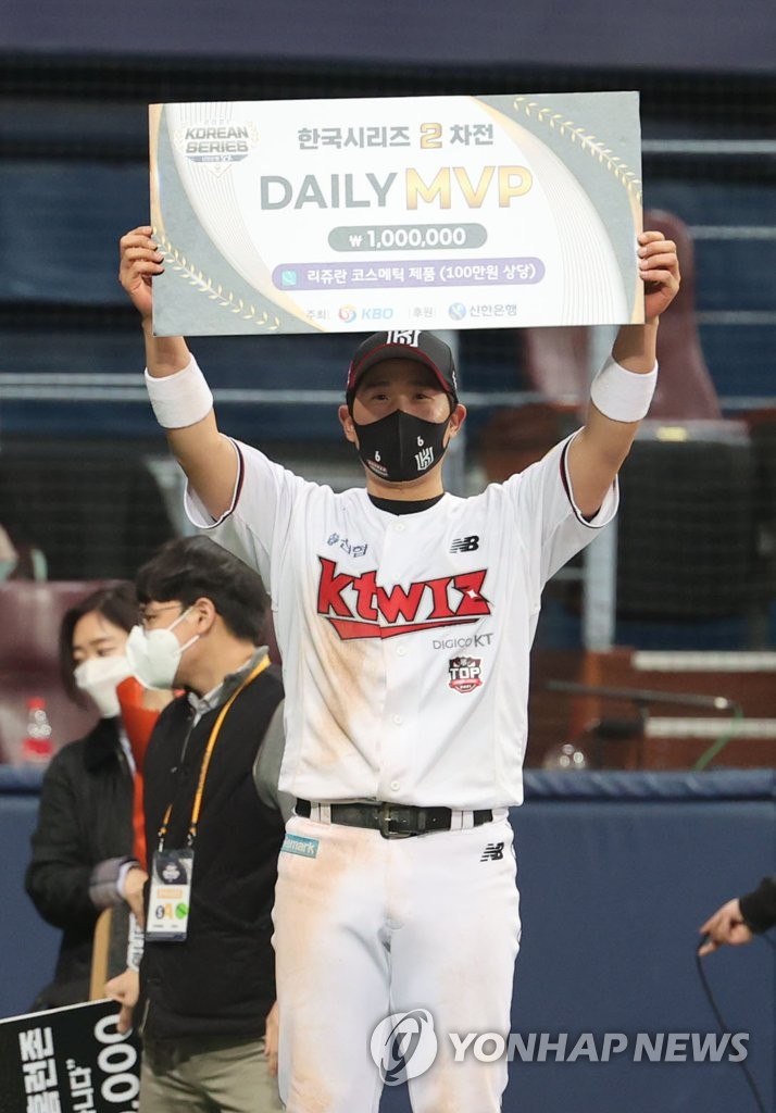 | ▲ KT Wiz second baseman Park Kyung-su holds up a sign as the Player of the Game in Game 2 of the Korean Series against the Doosan Bears at Gocheok Sky Dome in Seoul on Nov. 15, 2021. (Yonhap) |