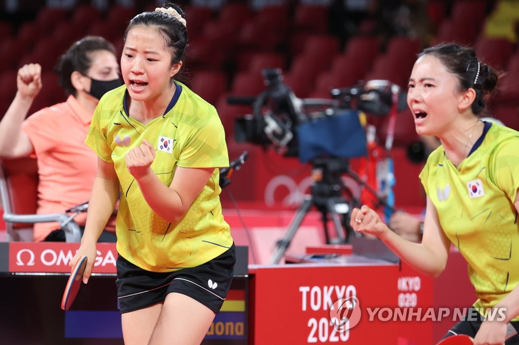 | ▲ Shin Yu-bin (L) and Jeon Ji-hee of South Korea celebrate a point against Shan Xiaona and Petrissa Solja of Germany during the quarterfinals of the women's team table tennis event at the Tokyo Olympics at Tokyo Metropolitan Gymnasium in Tokyo on Aug. 3, 2021. (Yonhap) |
