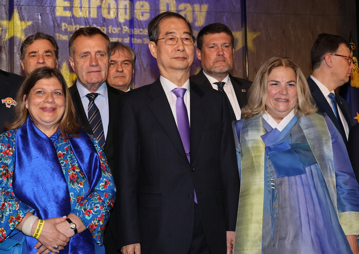 Former Prime Minister Han Duck-soo (C), an independent preliminary presidential candidate, attends a diplomatic event in Seoul on May 9, 2025, the 75th anniversary of Europe Day that celebrates the Schuman Declaration -- the historic proposal presented by French Foreign Minister Robert Schuman, widely regarded as the starting point of European integration. (Yonhap)