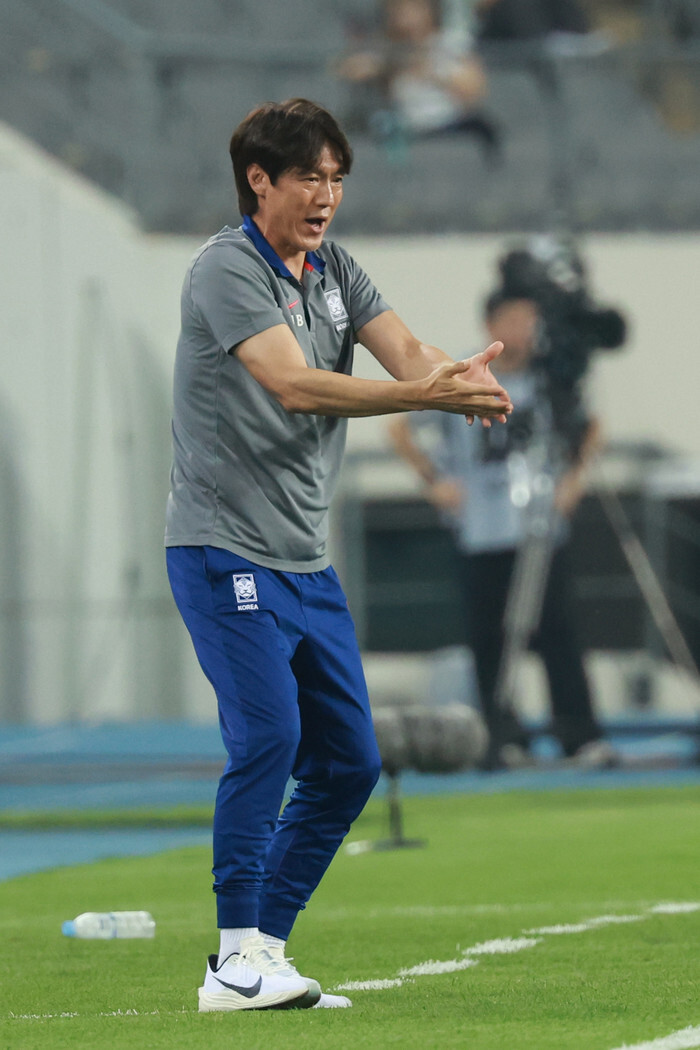 South Korea head coach Hong Myung-bo issues instructions to his players during the first half of an East Asian Football Federation E-1 Men's Football Championship match at Yongin Mireu Stadium in Yongin, south of Seoul, on July 7, 2025. South Korea won the match 3-0. (Yonhap)
