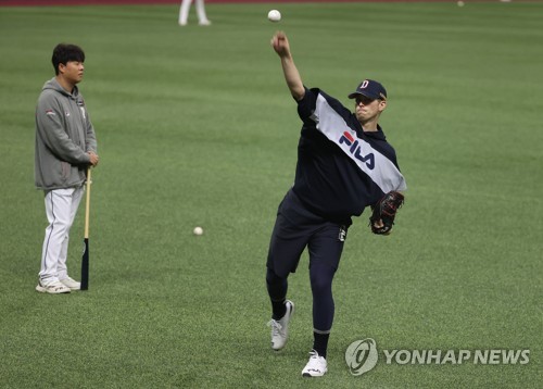 | ▲ 두산 플렉센 '한국시리즈도 내게 맡겨' (서울=연합뉴스) 이지은 기자 = 2020 프로야구 한국시리즈(KS) 1차전 두산 베어스와 NC 다이노스의 경기를 이틀 앞둔 16일 오후 서울 구로구 고척스카이돔에서 두산 투수 크리스 플렉센이 훈련을 하고 있다. 2020.11.15 jieunlee@yna.co.kr |