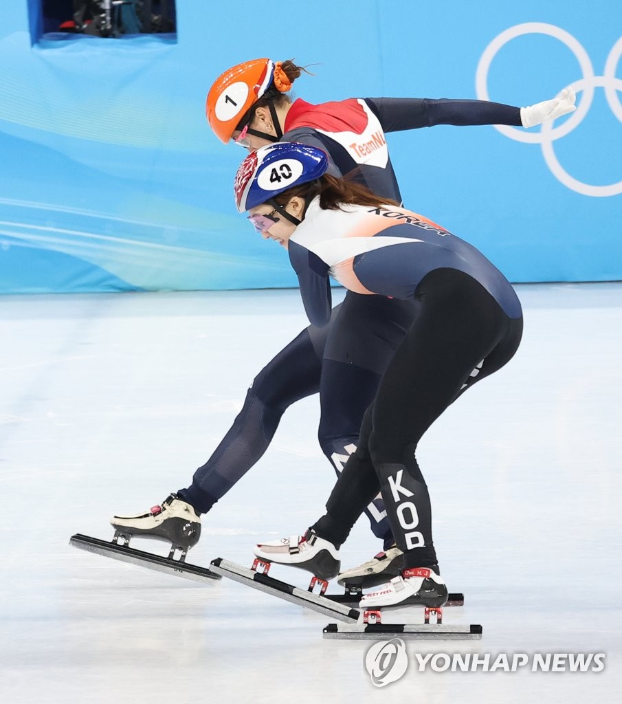▲ Choi Min-jeong of South Korea (front) finishes behind Suzanne Schulting of the Netherlands in the women's 1,000m final in short track speed skating at the Beijing Winter Olympics at Capital Indoor Stadium in Beijing on Feb. 11, 2022. (Yonhap)