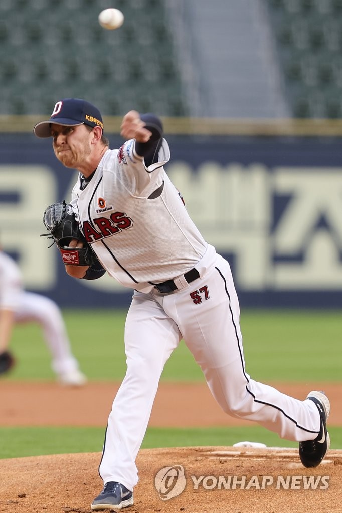 | ▲ Doosan Bears starter Brandon Waddell pitches against the Kiwoom Heroes during the top of the first inning of a Korea Baseball Organization regular season game at Jamsil Baseball Stadium in Seoul on Aug. 18, 2022. (Yonhap) |