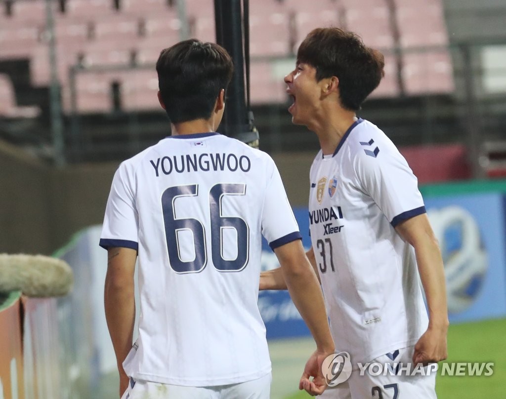 | ▲ Yun Il-lok of Ulsan Hyundai FC (R) celebrates his goal against Pohang Steelers during the clubs' semifinal match at the Asian Football Confederation Champions League at Jeonju World Cup Stadium in Jeonju, 240 kilometers south of Seoul, on Oct. 20, 2021. (Yonhap) |
