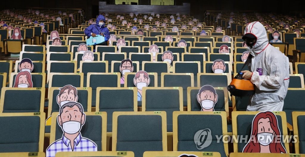| ▲ This photo taken on Oct. 17, 2021 shows a medical staff disinfecting seats of a cultural art center in Suwon, Gyeonggi Province, ahead of eased distancing rules that take effect on Oct. 18. (Yonhap) |