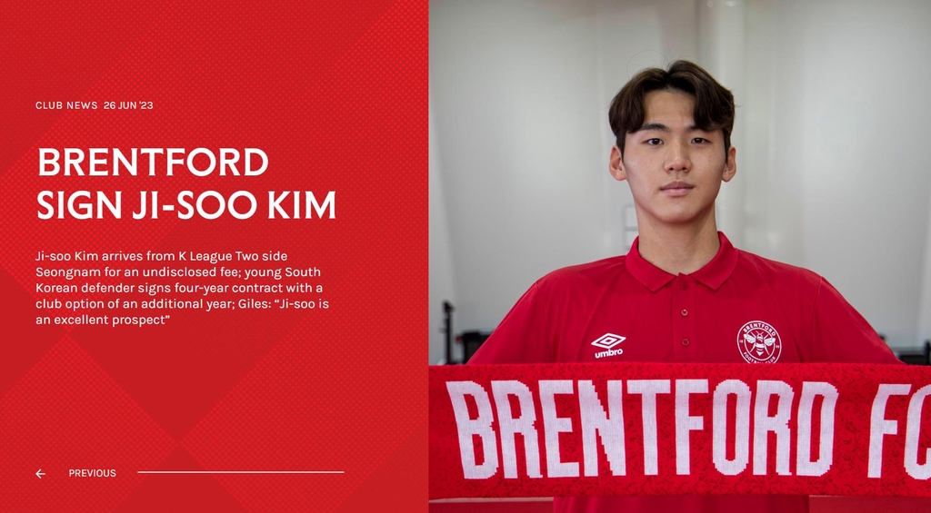 브렌트퍼드는 26일(한국시간) 홈페이지를 통해 "K리그2 성남FC에서 온 김지수가 계약 기간 4년에 옵션 1년을 포함한 내용의 계약서에 서명했다"라며 "이번 주 프리시즌을 시작하는 B팀에 합류할 예정"이라고 발표했다.