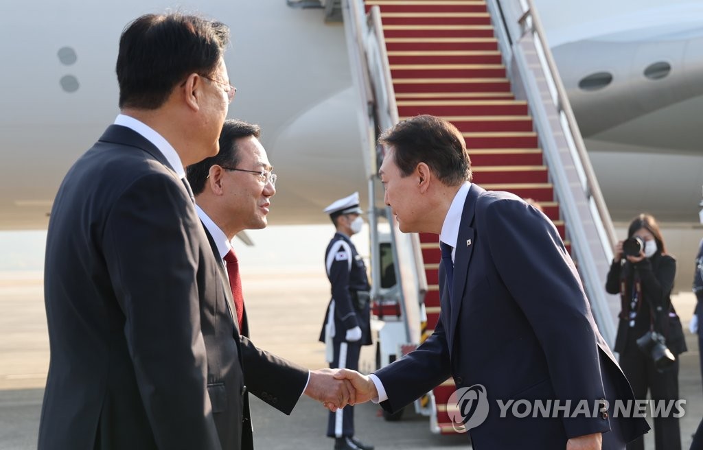 | ▲ 주호영 원내대표와 인사하는 윤석열 대통령 (성남=연합뉴스) 서명곤 기자 = 윤석열 대통령이 11일 오전 아세안(ASEAN·동남아국가연합) 관련 정상회의 및 주요20개국(G20) 정상회의 등 다자회의 참석을 위해 성남 서울공항에 도착, 공군 1호기로 향하며 국민의힘 정진석 비상대책위원장, 주호영 원내대표 등 환송 인사들과 악수하고 있다. 2022.11.11 seephoto@yna.co.kr |