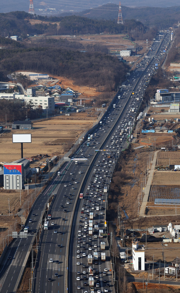 In this aerial photo taken from a Gyeonggi Bukbu Provincial Police Agency helicopter on Jan. 24, 2025, heavy traffic congestion occurs on southbound lanes of a highway linking Seoul to the southeastern port city of Busan in Anseong, south of Seoul, as the annual rush of travelers heading to their hometowns began one day ahead of Seol, the six-day Lunar New Year's holiday that runs Jan. 25-30. (Yonhap)