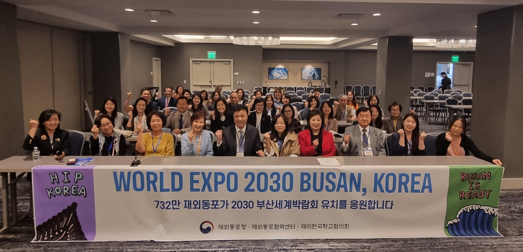 | ▲ 재미한국학교 교사들 '2030 부산세계박람회 유치' 응원 지난 20일 김영근 재외동포협력센터장과 재미한국학교협의회 소속 교사들은 미국 샌프란시스코에서 열린 학술대회에서 '2030 부산세계박람회 유치'를 응원했다. [재외동포협력센터 제공] |