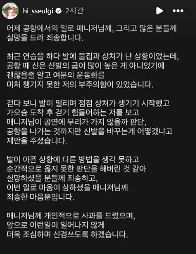 슬기는 자신의 사회관계망서비스(SNS)에 "연습을 하다 발에 물집과 상처가 난 상황이었는데, 공항에서 신은 신발의 굽이 높지 않아 부주의하게 여분의 운동화를 미처 챙기지 못했다"고 당시 상황을 설명했다.
