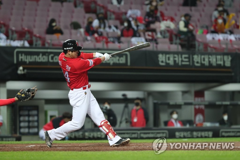 | ▲  Choi Jeong of the SSG Landers hits his 400th career home run against the Kia Tigers in the top of the fourth inning of a Korea Baseball Organization regular season game at Gwangju-Kia Champions Field in Gwangju, 330 kilometers south of Seoul, on Oct. 19, 2021. (Yonhap) |