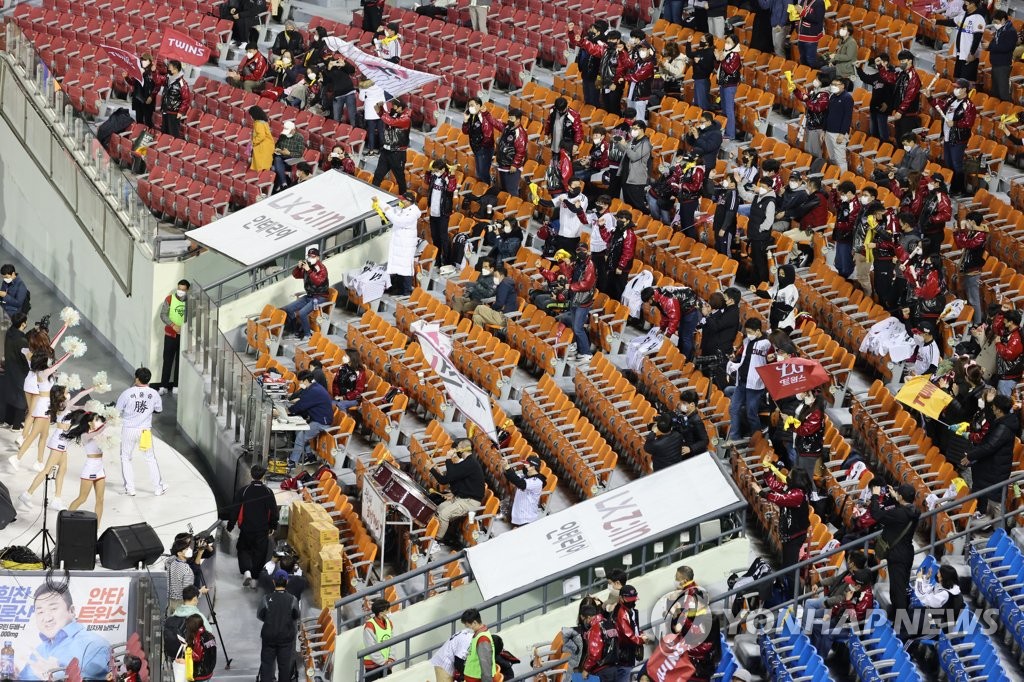 | ▲  Fans of the LG Twins cheer on their Korea Baseball Organization (KBO) club during a KBO regular season game against the Kiwoom Heroes at Jamsil Baseball Stadium in Seoul on Oct. 19, 2021. (Yonhap) |