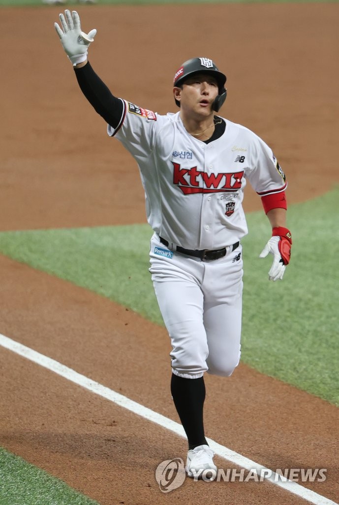 | ▲  Hwang Jae-gyun of the KT Wiz celebrates his solo home run against the Doosan Bears in the bottom of the first inning in Game 2 of the Korean Series at Gocheok Sky Dome in Seoul on Nov. 15, 2021. (Yonhap) |