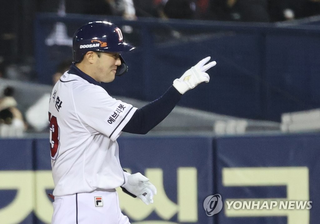 | ▲  Park Kun-woo of the Doosan Bears celebrates his single against the Samsung Lions in the bottom of the first inning during Game 2 of the second round in the Korea Baseball Organization postseason at Jamsil Baseball Stadium in Seoul on Nov. 10, 2021. (Yonhap) |