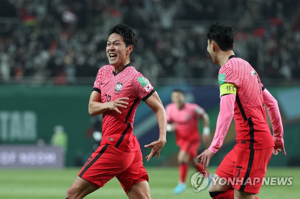 | ▲ Kim Young-gwon of South Korea (L) celebrates his goal against Iran during the teams' Group A match in the final Asian qualifying round for the 2022 FIFA World Cup at Seoul World Cup Stadium in Seoul on March 24, 2022. (Yonhap) |