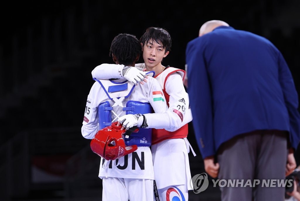 | ▲ Jang Jun of South Korea (C) embraces Omar Salim of Hungary after beating him in the bronze medal match of the men's 58kg taekwondo event at the Tokyo Olympics at Makuhari Messe Hall A in Chiba, Japan, on July 24, 2021. (Yonhap) |