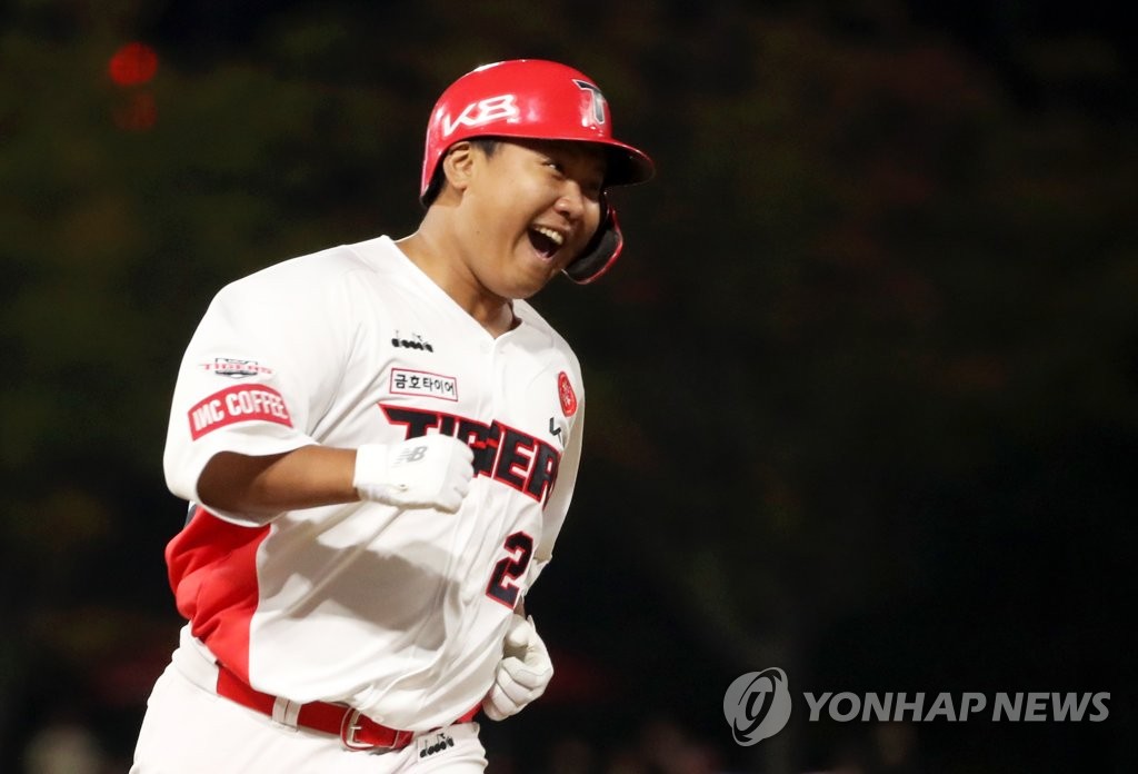 | ▲ Hwang Dae-in of the Kia Tigers rounds the bases after hitting a two-run home run against the KT Wiz during the bottom of the fourth inning of a Korea Baseball Organization regular season game at Gwangju-Kia Champions Field in Gwangju, 270 kilometers south of Seoul, on Oct. 7, 2022. (Yonhap) |