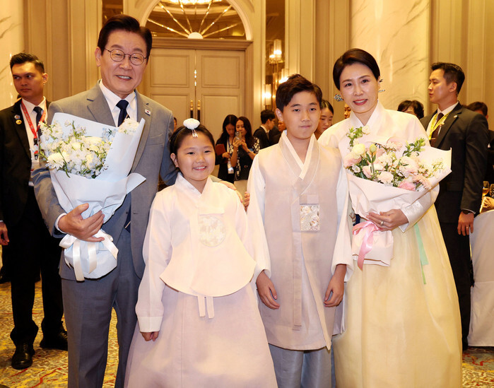 President Lee Jae Myung (L) and first lady Kim Hea Kyung (R) pose for a photo while attending a meeting with Korean residents in Malaysia on Oct. 26, 2025, during their visit to Kuala Lumpur for the Association of Southeast Asian Nations. (Yonhap)