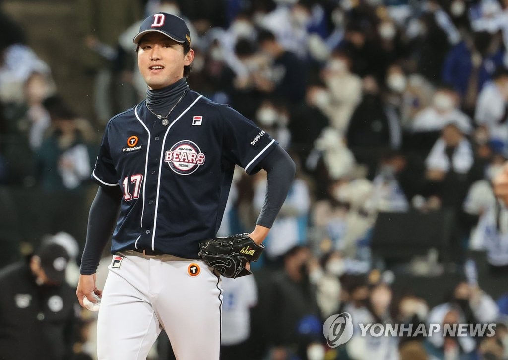 | ▲  Hong Geon-hui of the Doosan Bears returns to the dugout after retiring the side against the Samsung Lions in the bottom of the sixth inning during Game 1 of the second round in the Korea Baseball Organization postseason at Daegu Samsung Lions Park in Daegu, some 300 kilometers southeast of Seoul, on Nov. 9, 2021. (Yonhap) |