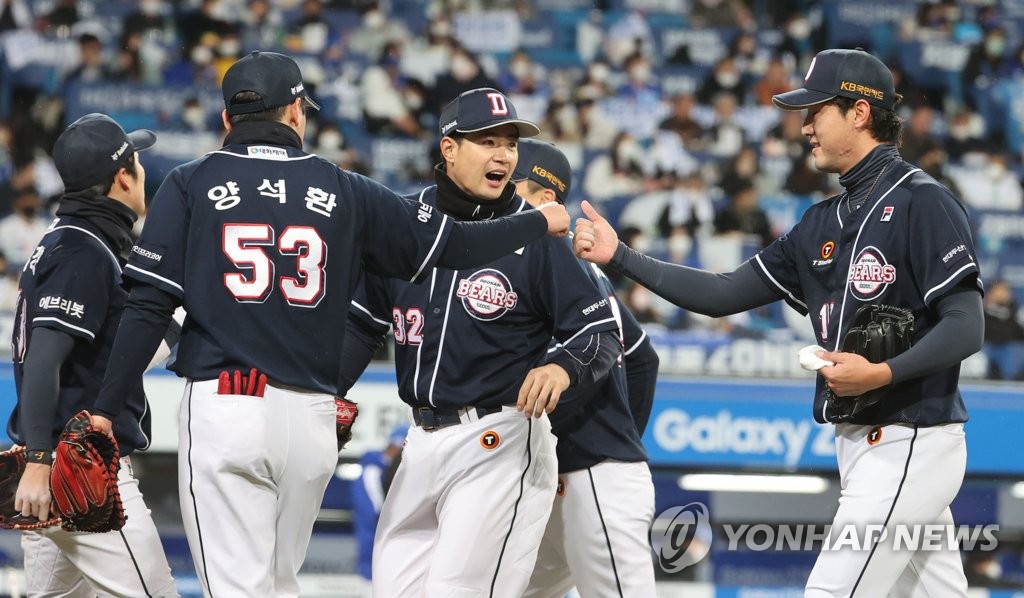 | ▲  Hong Geon-hui of the Doosan Bears (R) is greeted by teammates after retiring the side against the Samsung Lions in the bottom of the sixth inning during Game 1 of the second round in the Korea Baseball Organization postseason at Daegu Samsung Lions Park in Daegu, some 300 kilometers southeast of Seoul, on Nov. 9, 2021. (Yonhap) |